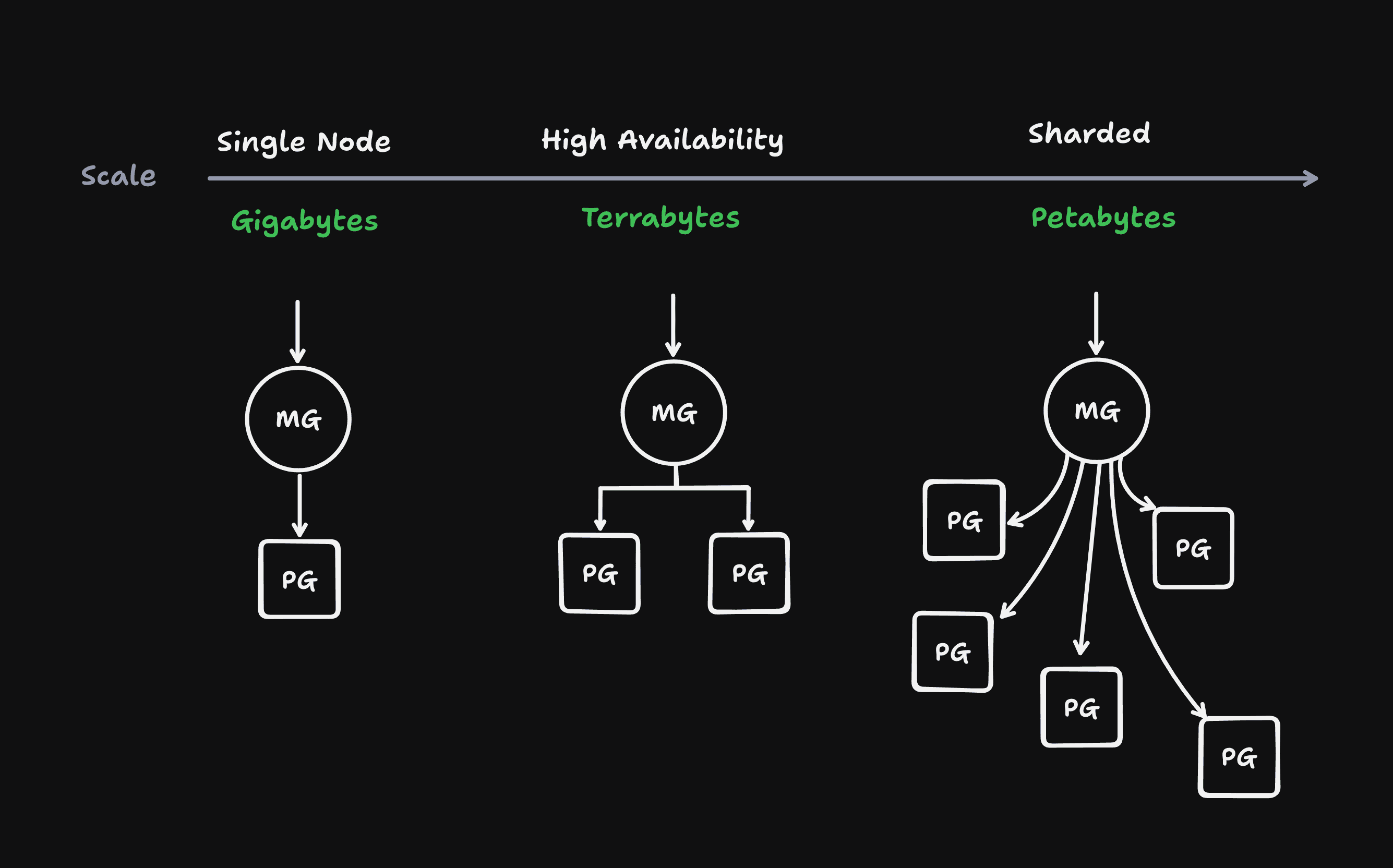 você começa com pooling, depois ganha alta disponibilidade, e só então sharding. Tudo sem mudar seu código.